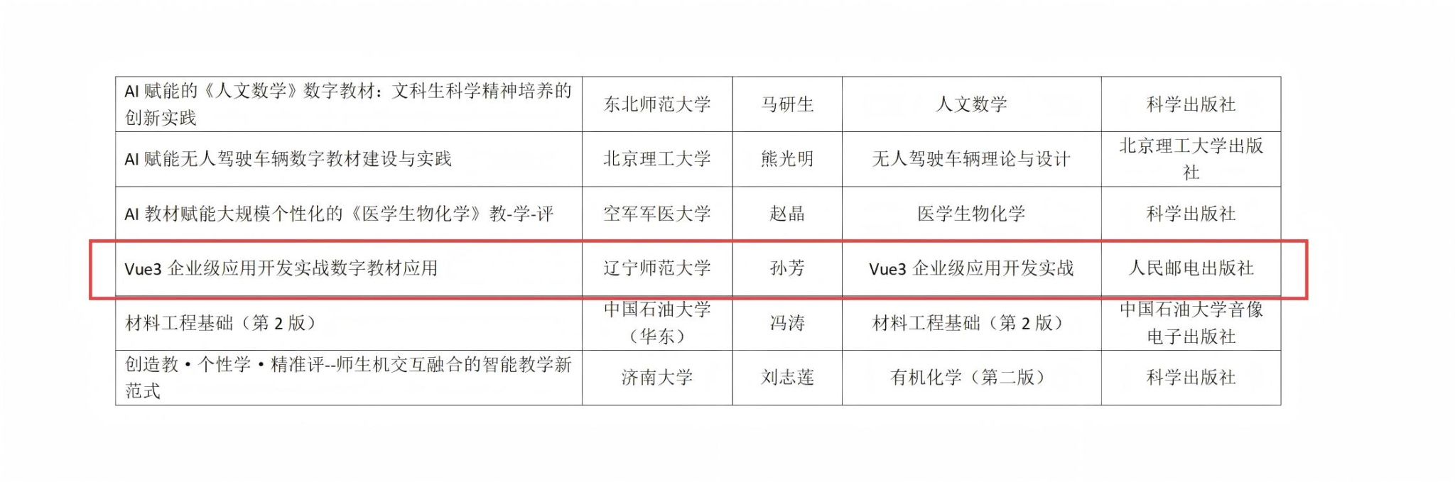近日,由全国高等学校教学研究中心、中国音像与数字出版协会数字教育出版工作委员会和高等教育数字教材创新发展联盟联合开展的“2025年数字教材应用案例征集活动”入选典型案例名单揭晓,共58个案例被认定为“2025高等教育数字教材应用典型案例”,我校孙芳老师主编的《Vue3 企业级应用开发实战》数字教材成功入选。