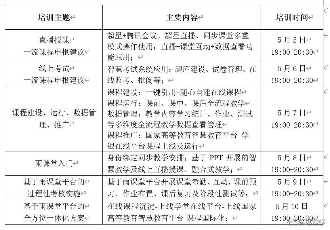 教务处组织雨课堂、超星平台面向我校教师进行集中专项线上教学培训。为方便教师学习,本次培训采取“在线直播讲解+回放巩固学习 +在线答疑指导”的学习形式。直播时间从5月5日至5月10日,回放有效期1个月。直播结束后,每位教师可随时浏览回放。参与直播及观看回放痕迹,数据后台将实时进行记录和更新,届时将作为衡量各教学单位组织教师参与培训、切实统筹落实提升教学水平的重要依据。