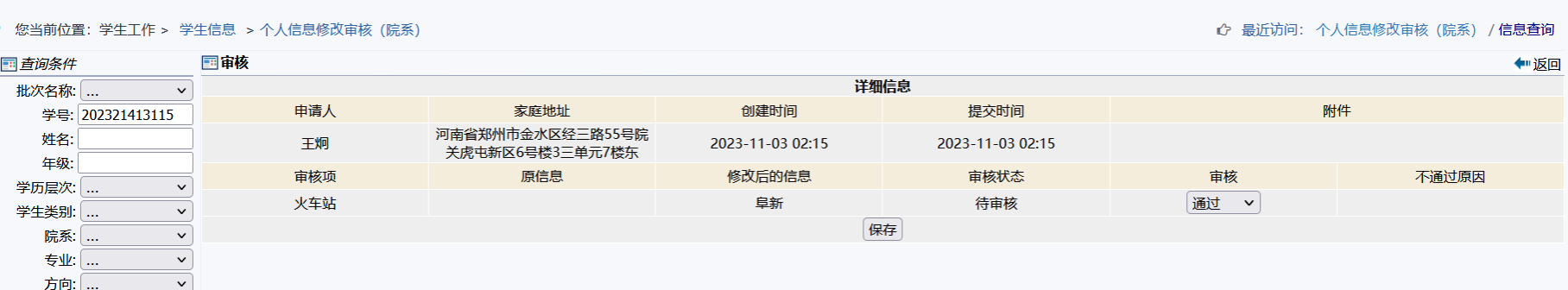 辅导员老师登录教务处教务系统中-学生工作-学籍信息-个人信息修改审核模块进行审核,确保学生所填站点真实准确。对乘车站点与家庭地区不一致的同学,请核准学生提供相关证明材料是否有效,对提供无效者予以驳回申请。完成时间:学院需要在11月7日(周五)17点前完成审核并提交,逾期原则上本学年度不再受理。
