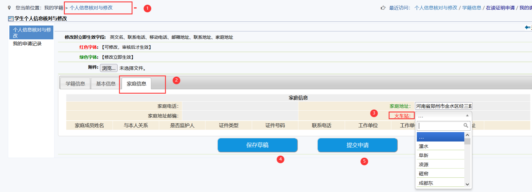 1.符合办理范围且有寒暑假回家探亲休假乘坐火车需求的学生本人,按照学生的家庭地区(仅限父母居住地)在教务系统中-我的学籍-个人信息修改-家庭信息-火车站模块下选择离家最近、最方便的火车站名作为办理乘车证的乘车终到站。选定后不得随意变更,学生务必与家长提前商定好,若教务系统中显示的生源地省份(源自录取数据)与学生的实际家庭地区情况不符,须在申请时在线提交下列材料: